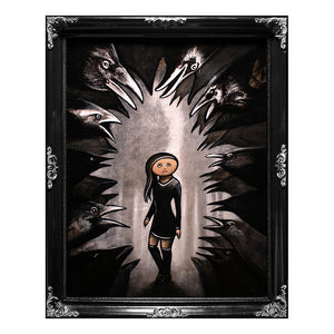 Art includes frame as shown, ready to hang. Acrylic paint on masonite wood panel with semi-gloss finish. Size listed is of the art size, not including frame. Sticker on back with name, size, and information.